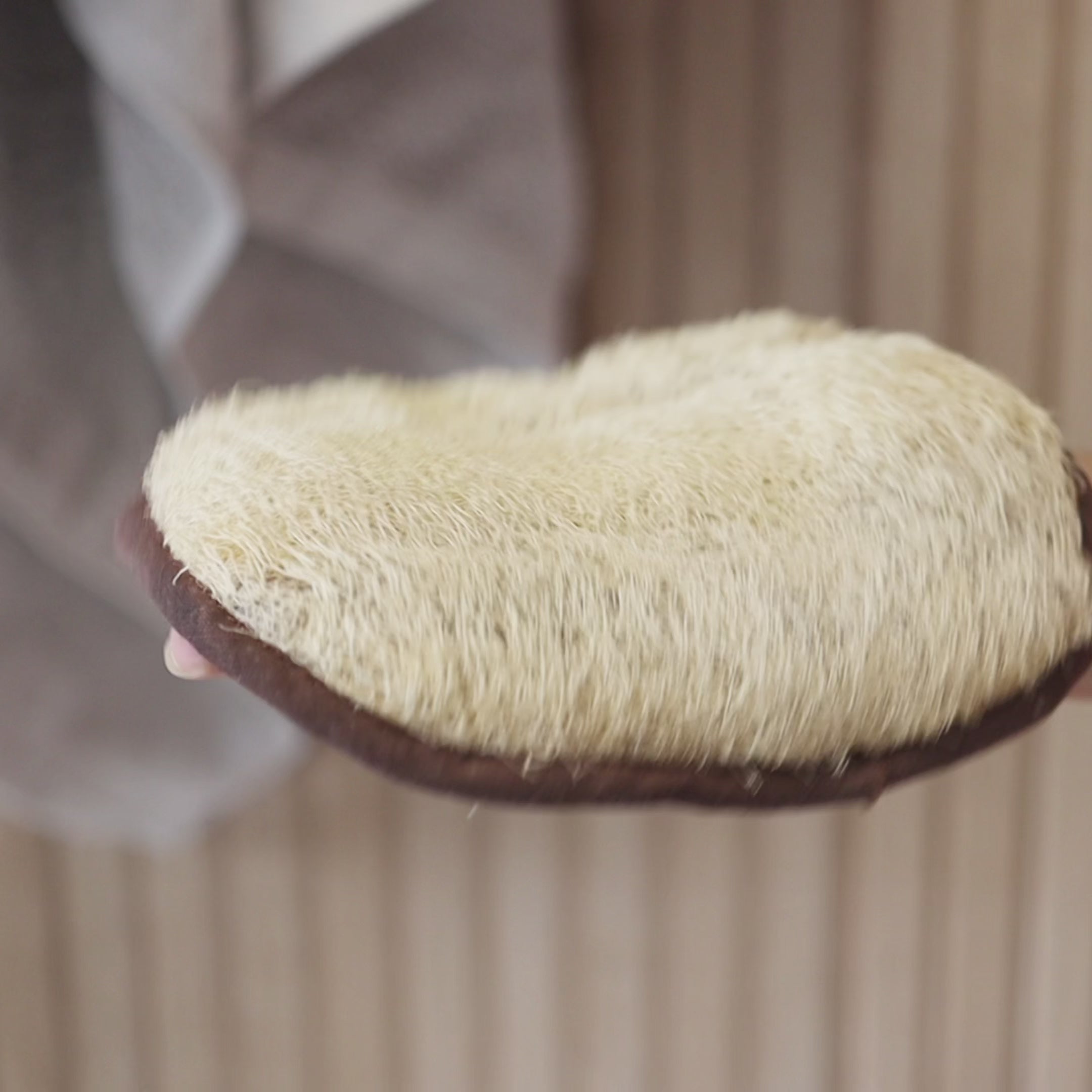 Disco exfoliante de luffa vegetal en gran formato. Suaviza la piel, activa la circulación y ayuda a reducir la celulitis.